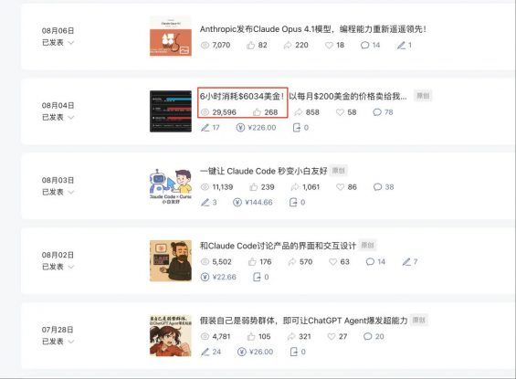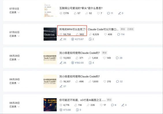 再看7月2日这一篇,也是一样。在发出之前,我就知道它肯定能到3万阅读以上(现在是5.87万)。 因为在7月2日,用户根本没见过,有人把Claude Code当成RPA来用。 不过,现在你可能已经见过了。我看了几篇,大多是洗我的稿,或是从我这里得到启发,做了一 些有用的延展。