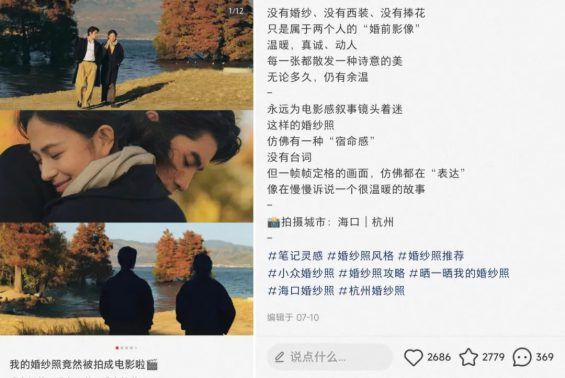 在小红书获取婚纱摄影客户,笔记内容是基础。一篇优质的笔记既能吸引目标用户停留关注,又能潜移默化地建立信任、引导咨询。 所以除了人设与定位,笔记的内容质量同样重要。 以下是小红书上面婚纱摄影账号热门的创作方向: (1)婚纱照拍摄案例 这是最直接展示摄影机构或者摄影师实力的内容,可以选取不同风格、不同场景的婚纱照作品,从服装造型、拍摄角度、后期修图等方面进行详细介绍。 以下图为例,这位婚纱摄影博主就以“第一人称”的口吻分享了一组电影婚纱照案例,并在文案中细致描述了拍摄理念。