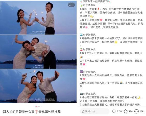 这类笔记主要是为用户提供实用价值,也是博主或者商家专业能力的体现。 以下图为例,这位博主就在推荐自家摄影师的同时,分享了关于妆容、风格方面的实用技巧,也是吸引不少用户在评论区咨询问价。