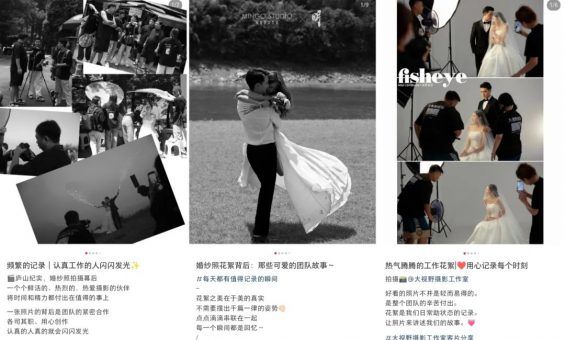 (4)幕后花絮 新人在选择婚纱摄影时往往存在很多的顾虑和疑问,比如“哪家工作室靠谱不踩坑?”“拍摄过程会不会很尴尬?”等,而这类幕后笔记就可以展现拍摄团队的工作日常,增加用户对团队的了解和信任。 商家博主们分享拍摄过程中的有趣故事、工作人员与新人的互动瞬间等,能够让用户感受到拍摄团队的专业和热情。