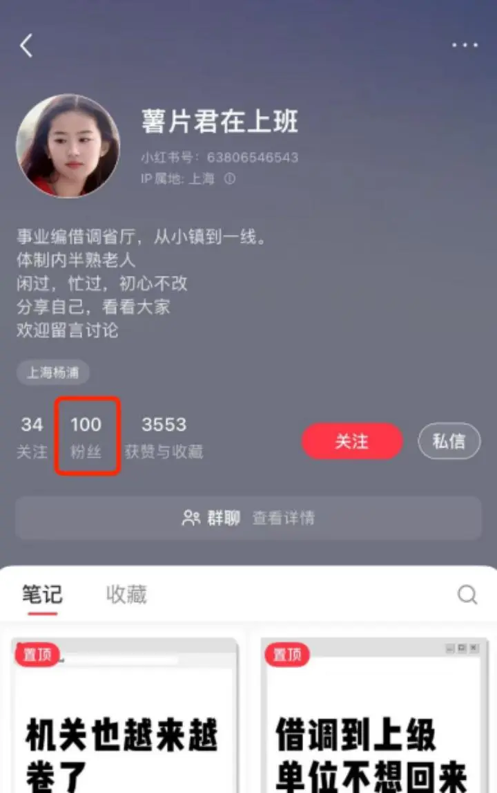 然后我们点开她的主页,发现她只有100个粉丝,那么这个笔记就符合低粉爆款的特性。