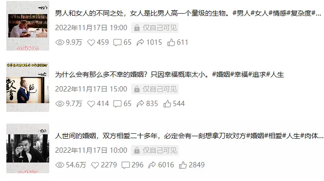 22年11月16日晚上,我抽空用剪映剪辑了3条冯唐老师语录视频和1条杨绛先生语录视频,然后定时11月17日发布在视频号上。 当时主要是测试,但没想到发冯唐老师的这个号视频发完就小爆了,播放量嘎嘎冲,账号很快就几千粉丝了。