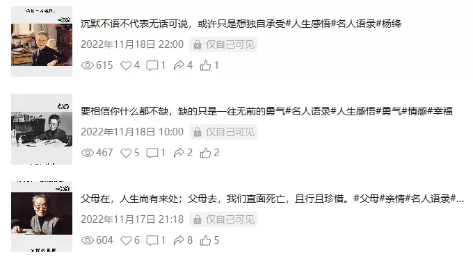 刚开始接触这个项目是22年底,当时有大学同学在做这个名人企业家语录短视频,说是能赚到些钱。 他做的内容就是视频展示杨绛先生、林徽因、莫言、余华、冯唐、马云、曹德旺、稻盛和夫等等名人企业家所说的文案内容(如下所示)。