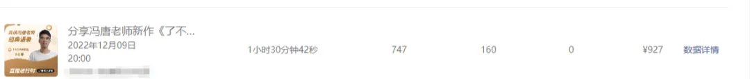 12月9日晚上,我下班回家,就搭了一个简单的直播间,桌上放着几本冯唐的书《冯唐成事心法》《有本事》等,并且提前打印好冯唐老师108句经典语录。 在稿定设计上导入自己头像做了一个粗糙的直播封面图,然后就直接出镜开播,通过直播给直播间的朋友讲解解析语录的含义。 中间穿插售卖了几次冯唐的书,一套能赚70多佣金,1个半小时,747场观,最高160人在线,销售额927元,我赚了460+佣金。