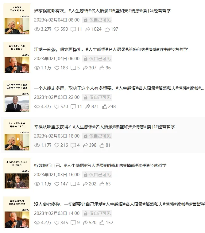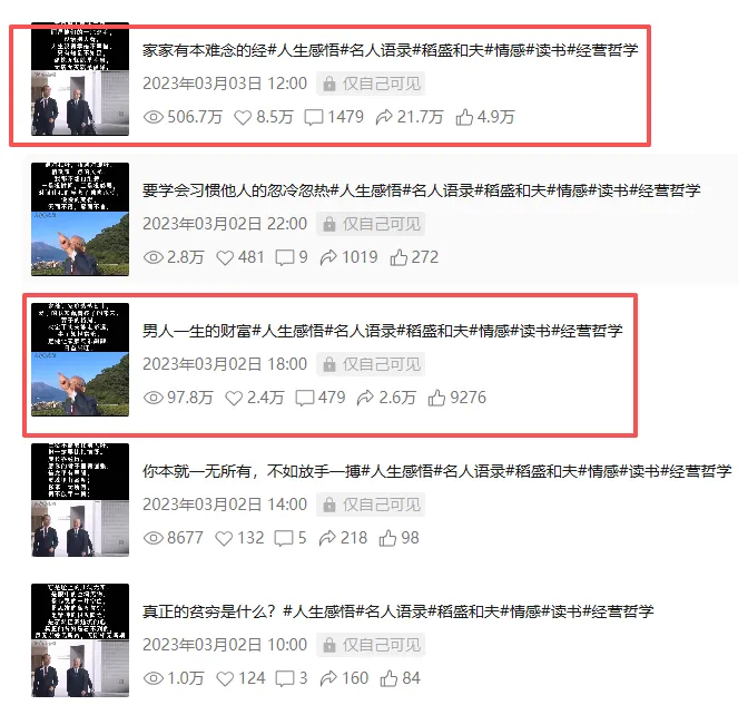12月下旬到23年1月初,我在视频号刷了很多对标账号,发现有些账号发稻盛和夫这个人物的视频流量还不错。 我研究了一下,发现稻盛和夫是个不错的切口: