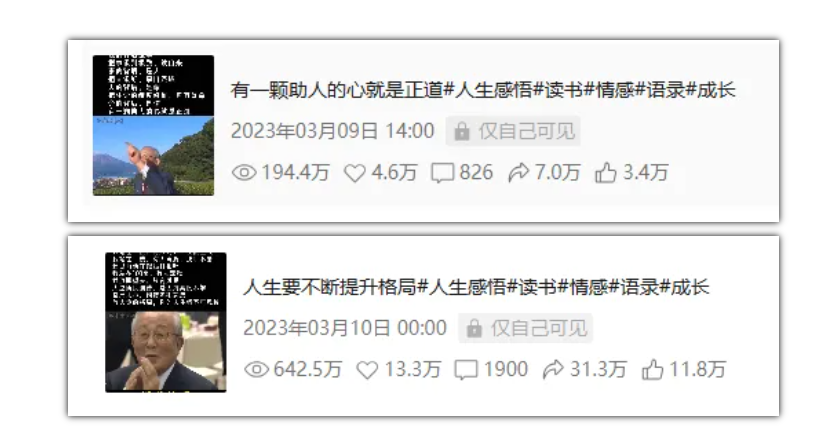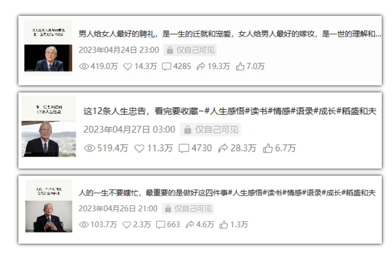 当时我就拿了其中一个视频号做稻盛和夫语录视频,自己上网搜索整理了一些稻盛和夫的语录,同时扒了一些对标账号的语录,形成了一份word文档【稻盛和夫的经典语录】。 然后就开始发视频,1-3月期间,整体流量还不错,也做过近10次直播,只是变现比较差。 直播卖书卖不动了,我一开始觉得是稻盛和夫太知名了,他的经典书籍很多人是不是都有了,所以没多少人会买。 正准备换下一个人物的时候,我刷到了另一个号,发现这个号做的稻盛和夫视频,条条几千点赞,甚至有数十条10万赞的视频,橱窗也卖了几千套书,佣金估计有个几十万。 仔细研究后,我发现3个特点: