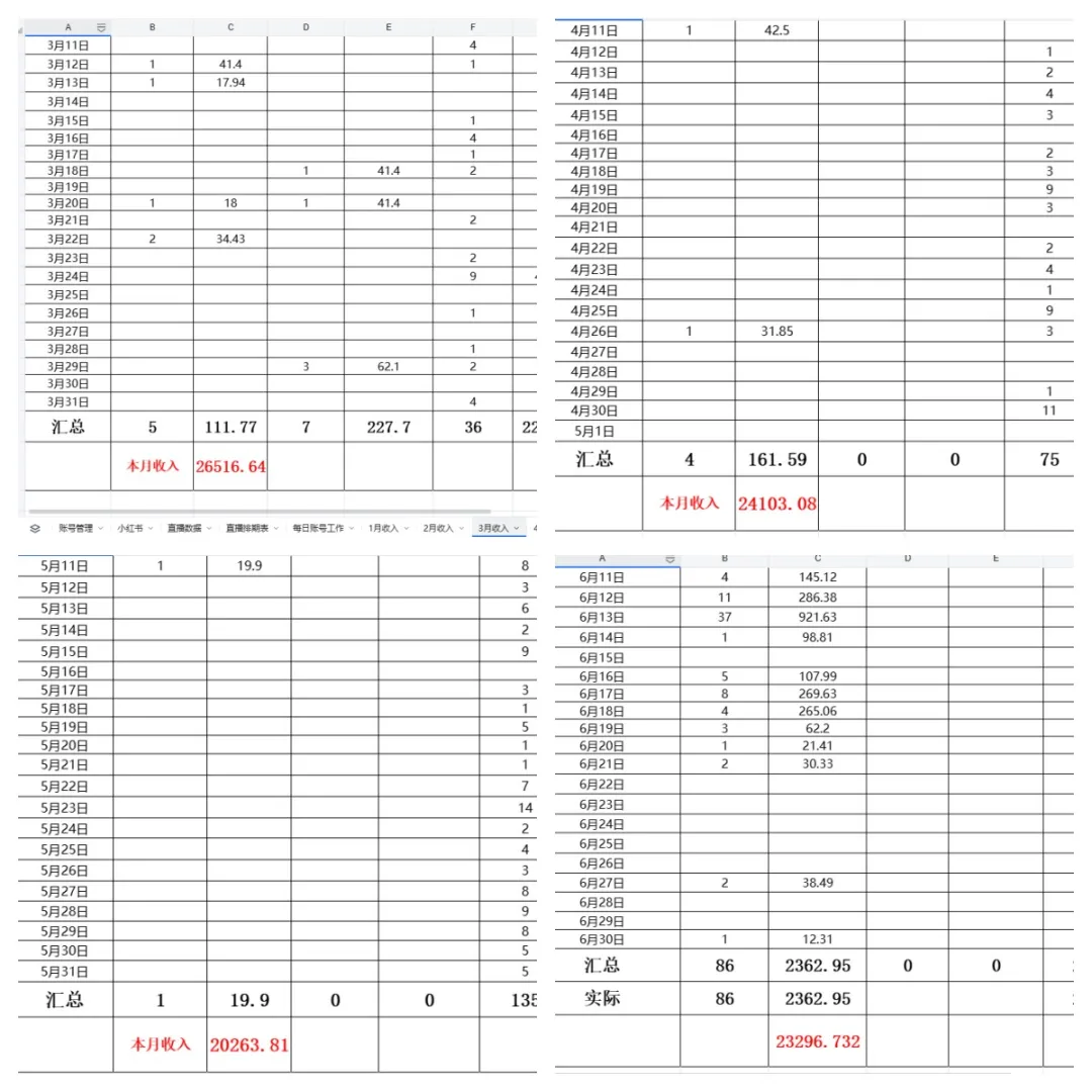 但是这时候的变现是很一般的,自然流量出单,最高的时候一天能到1000元,直播的话相对少,每天的直播流量被稀释了,一场挣几百块,加上这会我也不懂,视频爆了就要开播的。 等到反应过来,流量已经跑得差不多了。如果换成是1个月后的我,这波流量至少能赚大几万。因为一个月后的我在生财里了。 整个3月份下来,我赚到了1万+佣金。 运气比较好,4月初A账号持续在爆视频,基本都几十万到上百万。