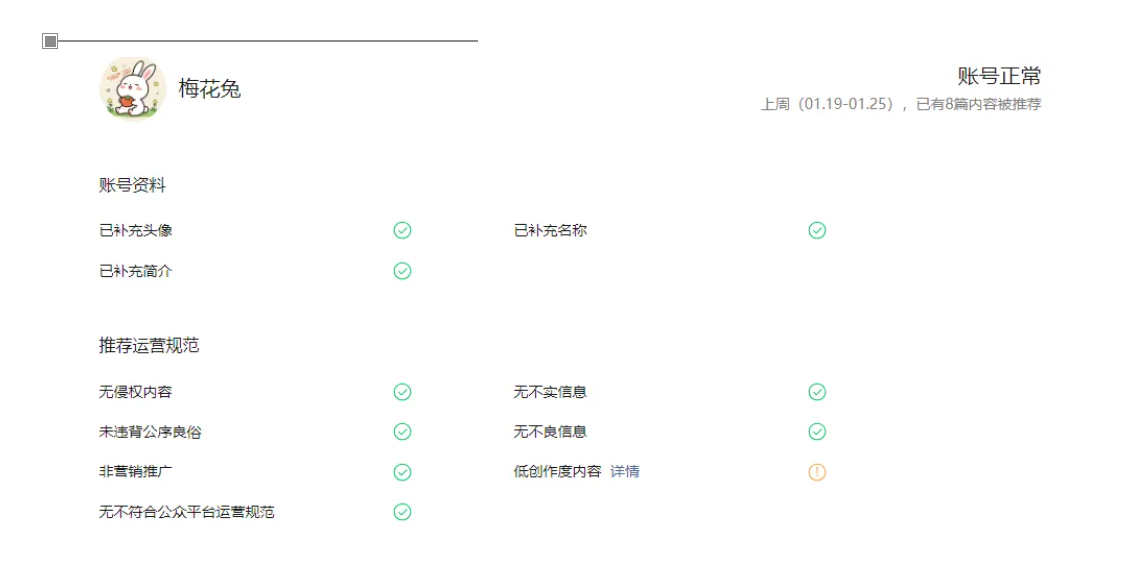 利用上面的方法,我点击进入之后,发现我的账号虽然处于正常。但是,在“无低质量文章”那里,出现了橙色的感叹号。这说明账号有低质量文章出现。 2 低质量文章