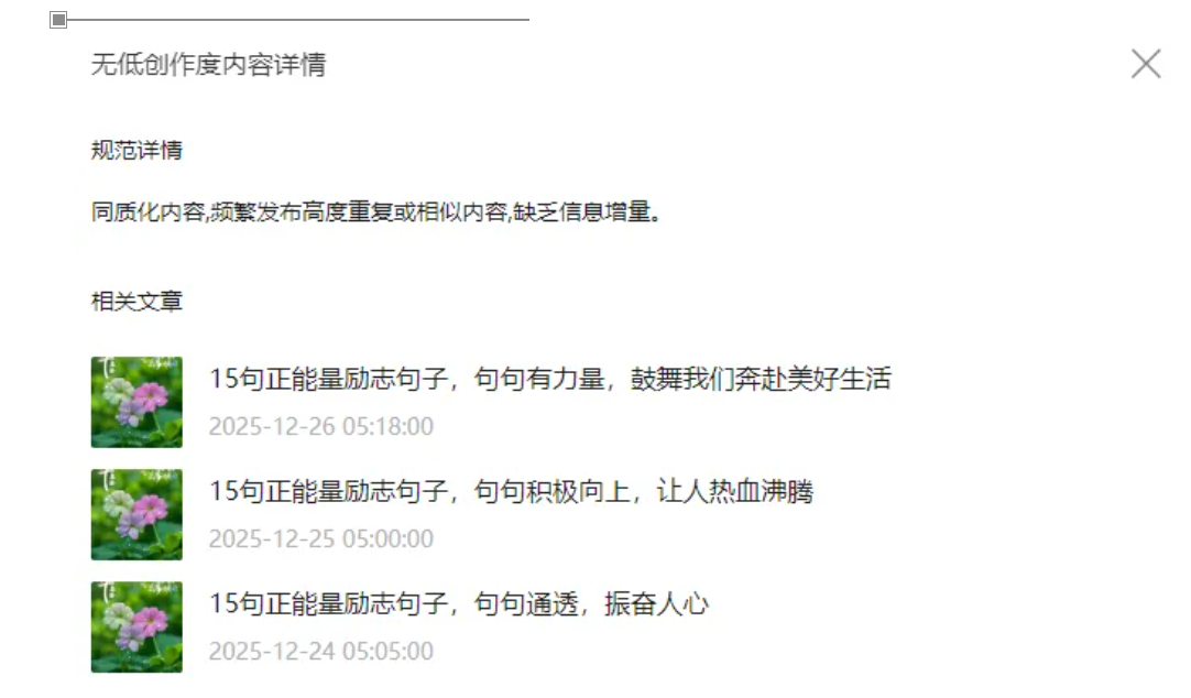 账号出现了问题要及时处理,要不然你的文章很难被推荐,会限流。 出现低质量问题,有以下几种解决方法: 1、单篇低质量文章可以直接删除。 2、如果多篇低质量文章,每天删除不能超过3篇,可以选择在凌晨或者晚上较晚,阅读人较少的时候,这样不会影响账号。要不然系统会判定你的账号有问题,存在风险。 3、文章删除之后,再次进行检测,看下账号是否回复正常。 如果没有恢复正常,需要进行申诉。 下面是申诉的话术,可以借鉴。 单篇低创申诉: 您好,我的公众号【XXX】单篇文章《XXX》被判定低创作度内容,我已对该文章进行【删除 】处理( 删文记录)。 该文章因前期创作经验不足,部分内容引用不当 ,现已完成整改,后续会严格把控内容特色,恳请平台复核并恢复该文章推荐。 多篇文章申诉: 您好,我的公众号【XXX】因近期部分文章被判定低创作度导致账号限流,我已在【X 天】内完成所有低创文的清理整改(共处理 X 篇,其中删除 X 篇、改写 X 篇、关闭推荐 X 篇,附删改记录截图)。 后续我会建立内容自查机制,坚持输出有价值、有个性的内容,恳请平台复核并恢复账号正常推荐权重。 4 结语