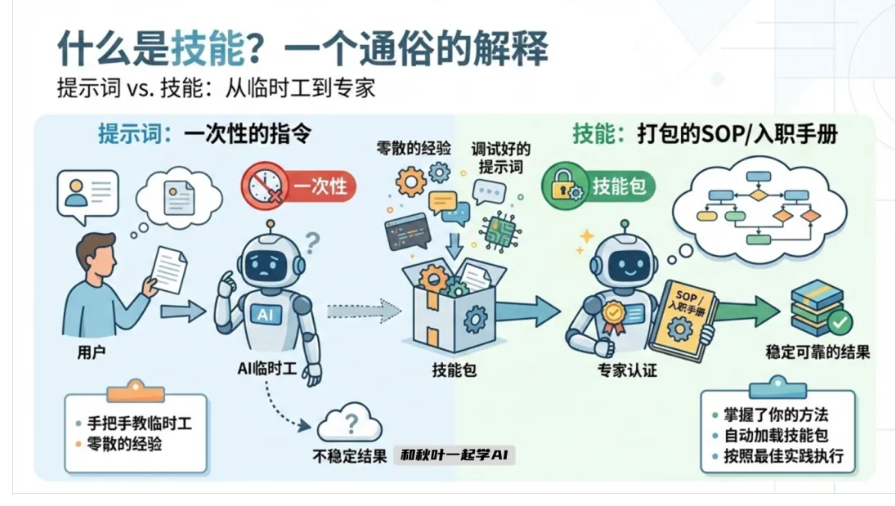 而技能,就相当于你给 AI 整理的一份标准作业流程(SOP)或者入职手册。