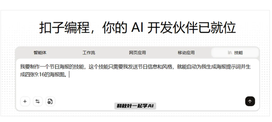 你只需要进入扣子编程选择技能模式,把你的需求像聊天一样告诉它。比如,我们可以直接把这段话发给扣子: