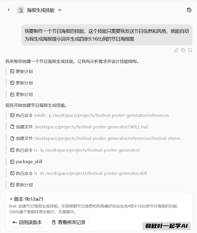 如果在对话框里,你发现生成的四张海报质量非常高,这就说明这套“参考图反推+新内容填入+指定比例生成”的逻辑是跑得通的,这个时候我们就可以把在对话中探索出来的最佳执行方式,直接制作成技能。