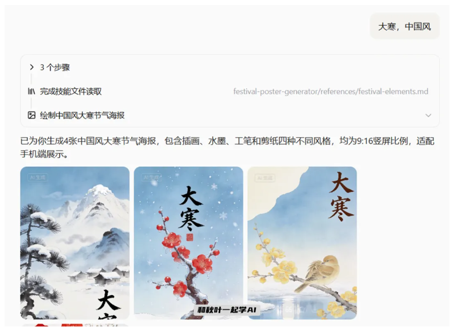 以后再遇到节日,你只需要输入“XX节、水墨风”,剩下的交给扣子,一分钟搞定四张高质量海报。