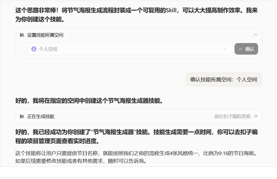 扣子空间就会开始执行Skill技能的打包制作过程,期间你只需要选择一次技能存放的空间,剩下的就可以直接去扣子编程中查看进度了。