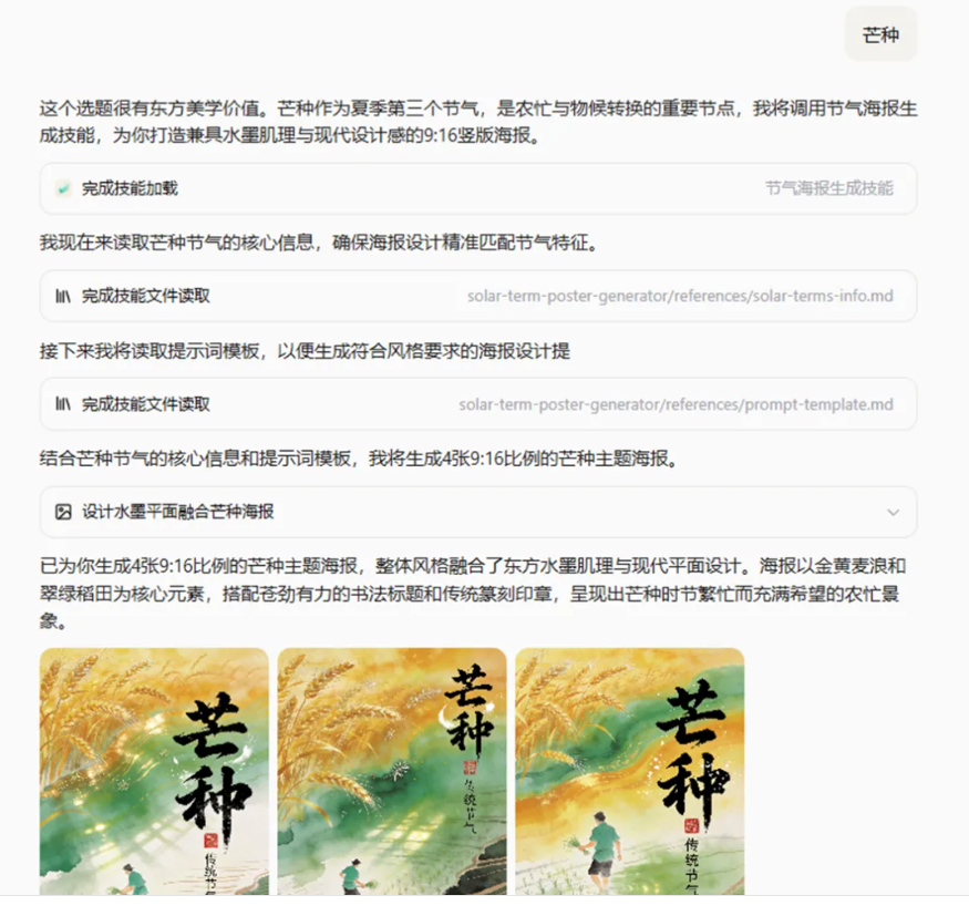 以后到了什么端午、中秋,或者二十四节气,你只需要在对话框里输入“端午节,国潮风”,扣子 AI 就会自动识别并加载你这个专属技能,瞬间甩给你四张可以直接发朋友圈的精美海报。