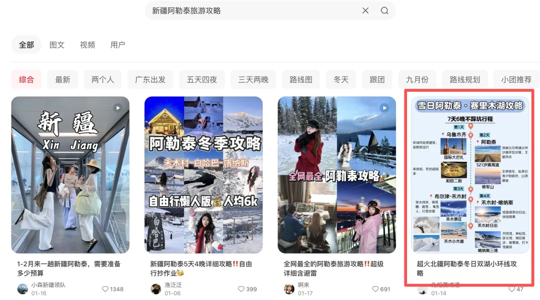 你搜「冬季旅游」,会发现近期发的笔记,比半年前的更容易排在前面。