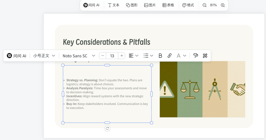 (因为是背后接入了nanobanana一次性生成的PPT样式的图片,不能修改文字。目前只能用WPS打开PDF文件,然后用PDF转PPT,把文字识别出来,然后一个一个的修改。所以好看但是不好改。没有文字图层这个问题是目前感觉AI生图的最大局限,相信也有很多公司和团队都在努力的解决这个问题。没准再过半年这个问题就解决掉了。我们做PPT的方式就真的变天了。)