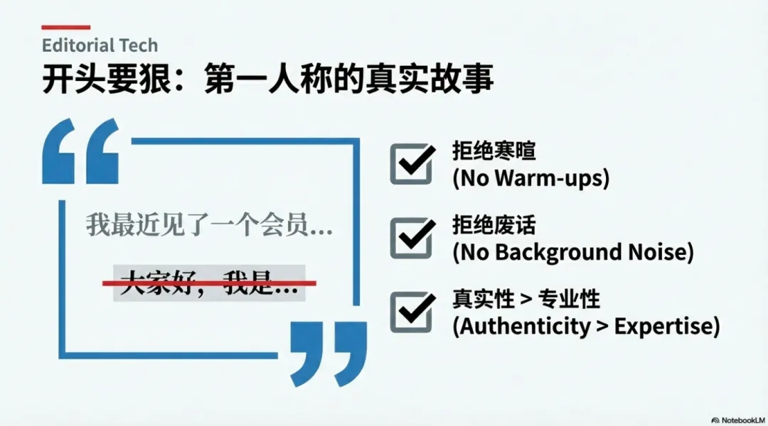 当你用第一人称+具体场景切入时,读者的防御心理是最低的,他会下意识地觉得,我要听到一个秘密了。
