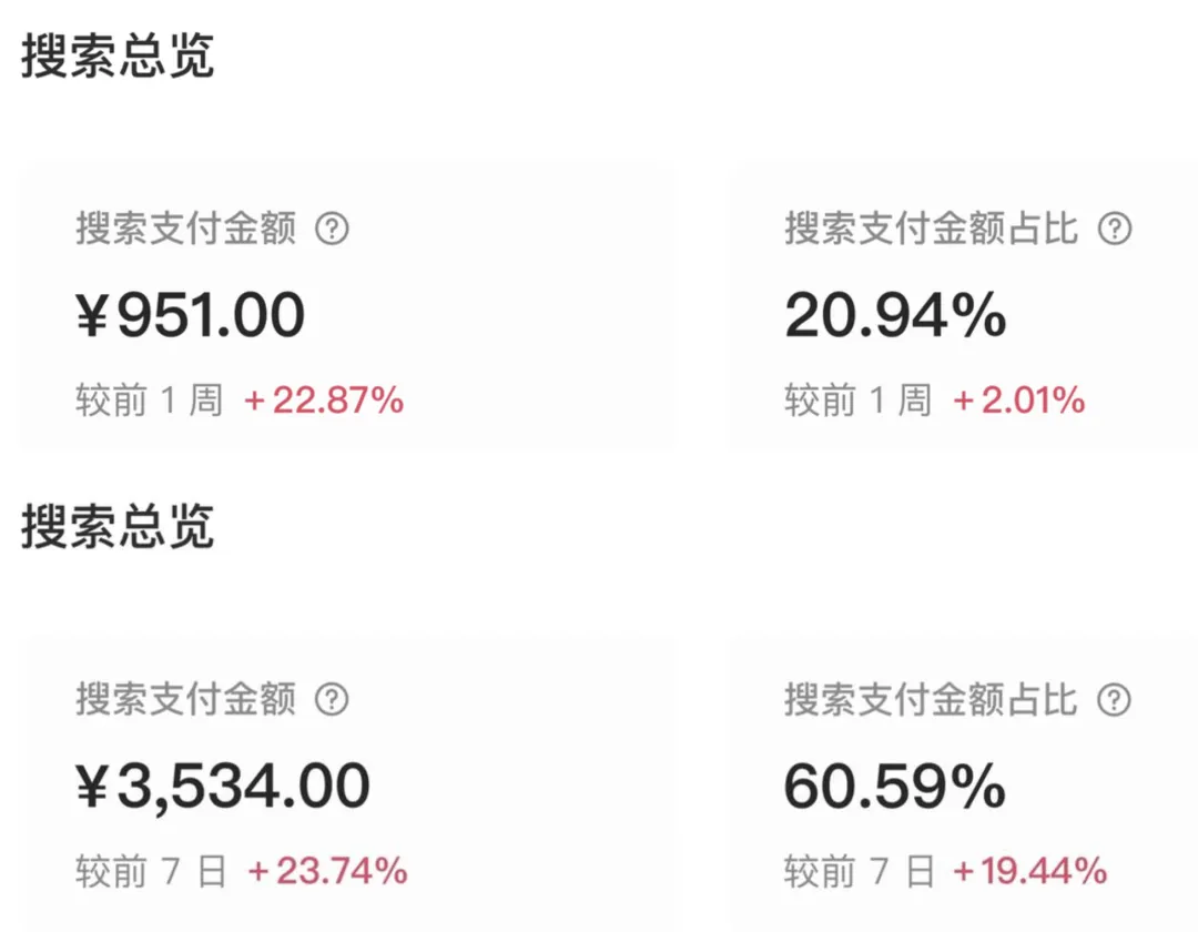 7天搜索支付金额从950,变成了3500,翻了3倍,7天多赚了2500块。