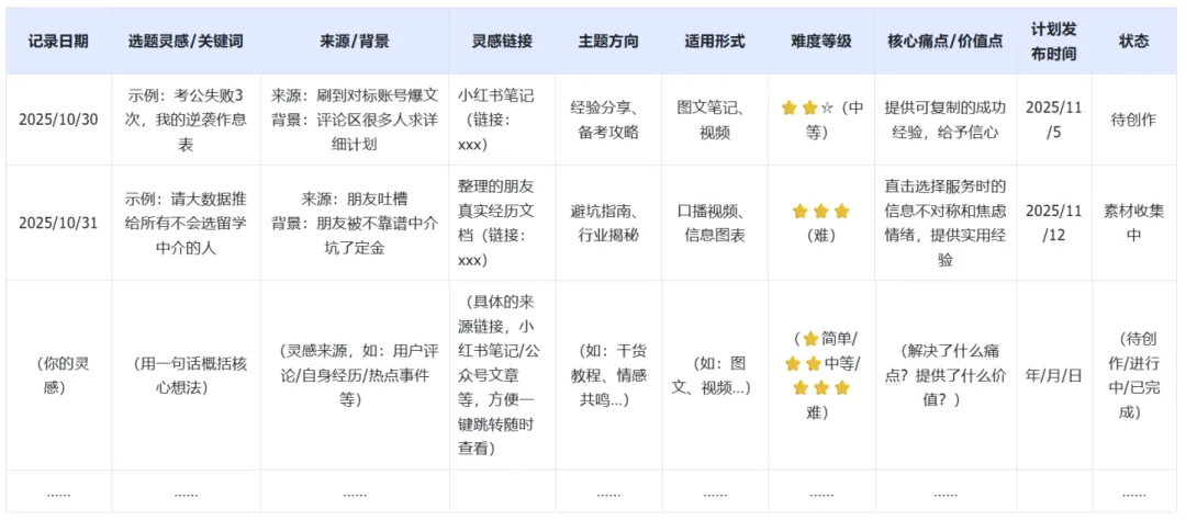 随时记录灵感。比如看到用户痛点评论,刷到相关爆款,想到自身经历,听到朋友吐槽… 立刻用备忘录/飞书文档/石墨文档记下来!按“主题方向”,“适用形式”,“难度等级”简单分类。