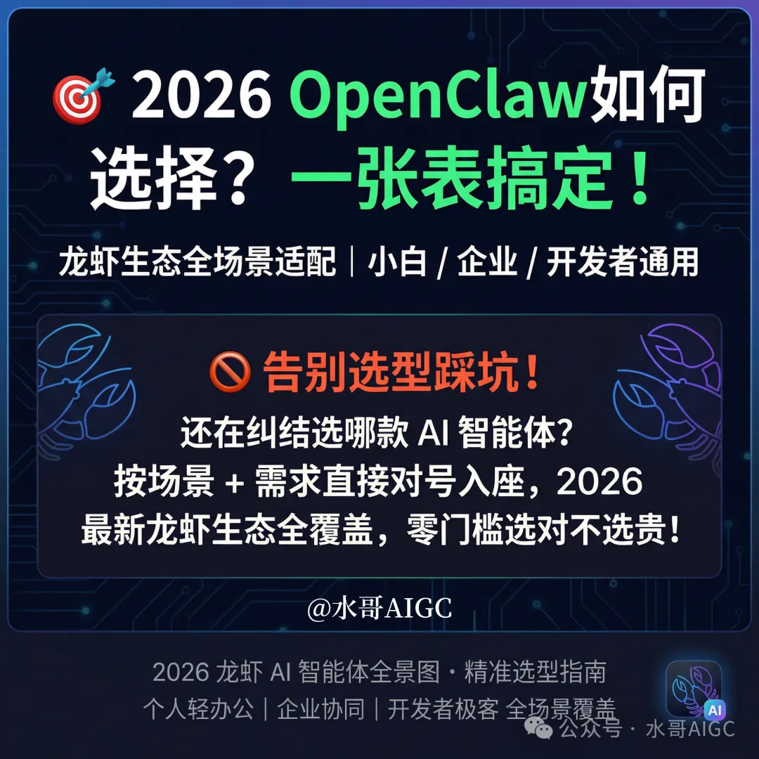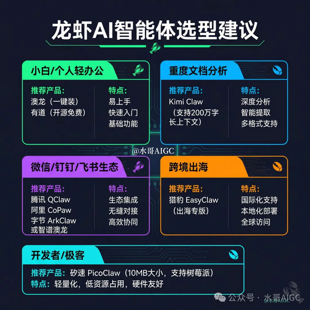 小白/个人轻办公:直接上网易有道(完全开源免费)或者智谱澳龙(一键直装)。简单易上手,基础功能拉满。 重度文档分析师:无脑选Kimi Claw,支持200万字长上下文,扔几十个文档进去,深度分析加多格式支持,直接吐出核心摘要。 吃透大厂生态协同:你的业务如果说离不开微信的话,那就选腾讯的QClaw;离不开钉钉就选阿里的CoPaw;飞书协同就选字节的ArkClaw。无缝对接,决定了你的流转效率。 赚老外钱的跨境出海:直接拿猎豹EasyClaw(出海专版),搞定国际化支持和本地化部署,做全球访问必备。 开发者与极客玩家:直接就用砂速PicoClaw,10MB极小体积,低资源占用,硬件极度友好。 今天这篇文章,帮大家彻底解决了选哪个的问题。 但是,水哥想说一句掏心窝子的话,工具再牛,它也只是个锤子,怎么用这个锤子去敲开财富的大门,才是我们真的要重点考虑的。 大厂在建生态,我们普通人要做的,就是在这个生态里找到属于自己的杠杆。 比如怎么用腾讯的QClaw跑通一套全自动转化的微信私域SOP?怎么用阿里的钉钉生态抓取数据,做一个自动赚钱的电商流?怎么用这些大厂的底层工具,一个人活成一支队伍? 如果你不想只停留在玩工具、凑热闹的阶段,而是想在2026年真正利用AI赋能你的个人商业,把AI变成你的超级数字员工。 |