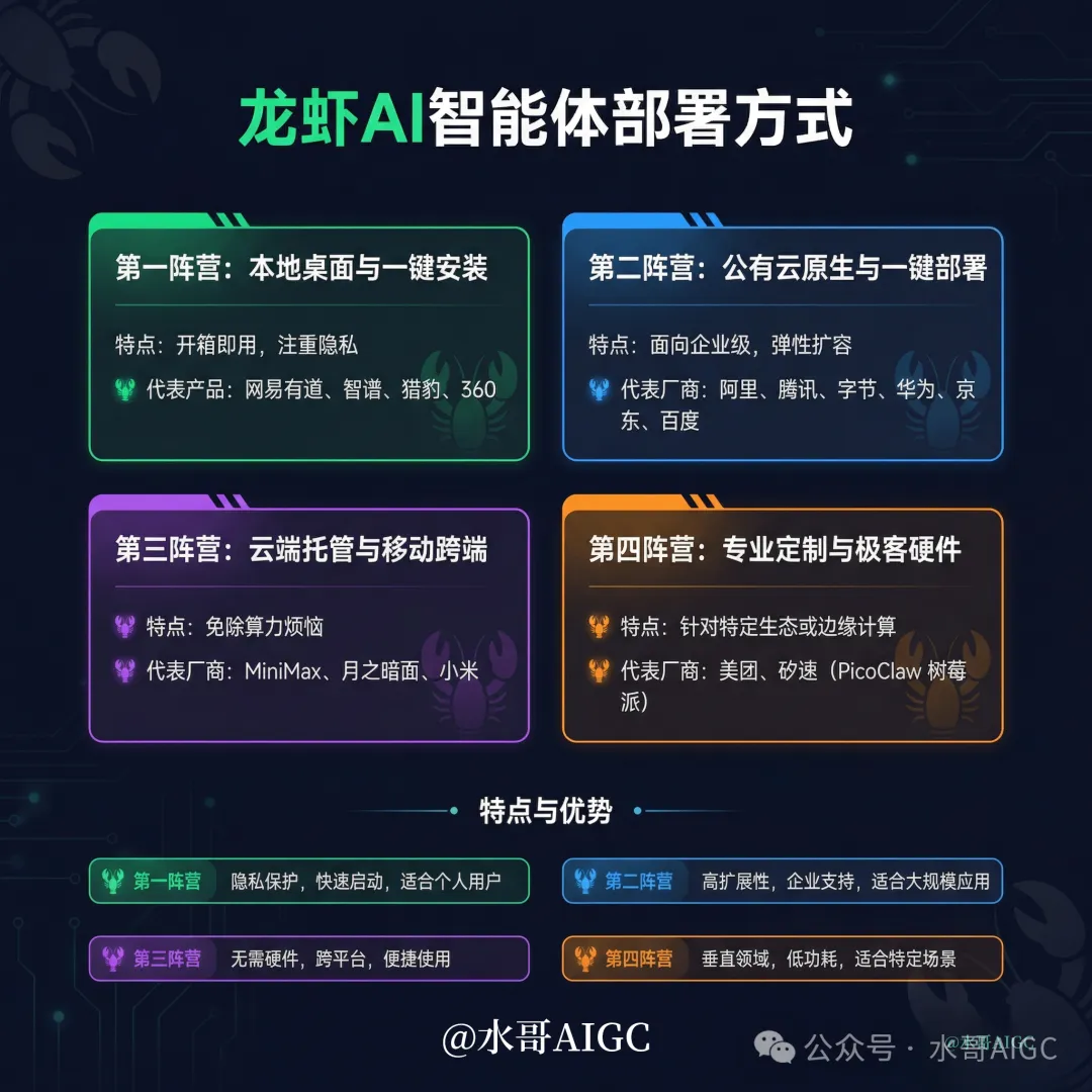 第一阵营(本地桌面与一键安装) 主打一个开箱即用和注重隐私。代表选手是网易有道、智谱和猎豹。打工人写日报啊、做PPT这些,装在自己电脑里最踏实。 第二阵营(公有云原生与一键部署) 这是给老板和企业准备的。阿里、腾讯、字节这种,高扩展性,直接对标企业级的大规模应用协同。 第三阵营(云端托管与移动跨端) 跨平台便捷使用,免除本地算力和硬件的烦恼。代表厂商是MiniMax和月之暗面。 第四阵营(专业定制与极客硬件) 属于进阶领域和低功耗场景。比如跑在树莓派上的砂速(PicoClaw)微型系统,或者美团那种深挖垂直领域的定制方案。