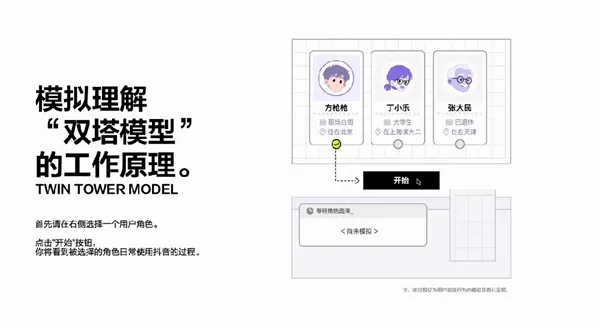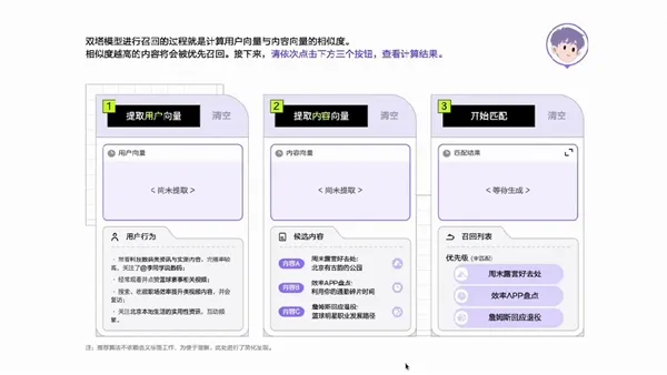 双塔模型是抖音进行高效召回的主力模型之一,体验者可代入不同用户角色,看到算法计算虚拟用户与视频的推荐指数,直观感受内容与用户的匹配逻辑: