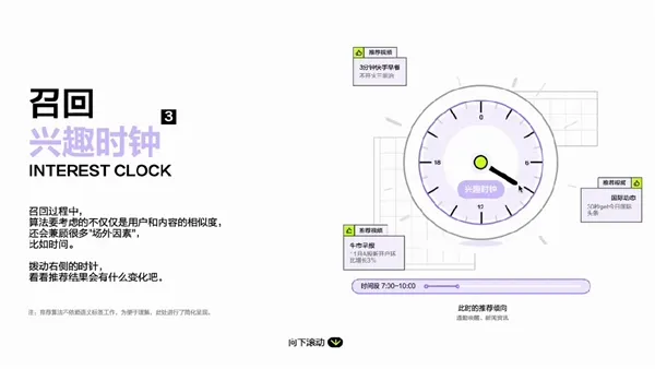拨动兴趣时钟指针,便能发现算法还会兼顾“场外因素”,比如依据时间调整推荐倾向,贴合用户不同时段的兴趣偏好: