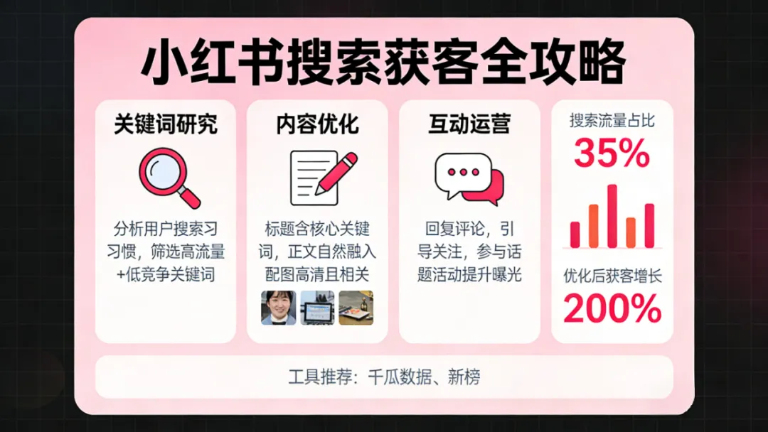 放弃10万粉执念:死磕100个长尾词,3个月让咨询量暴涨5倍的底层逻辑! 你有没有想过这样一个问题:为什么有些账号粉丝不多,但每天都有稳定的精准客户咨询?而有些账号粉丝几万,却很难转化? 答案不在粉丝数量,而在一个被绝大多数人忽视的流量入口——小红书搜索。 小红书搜索获客到底是什么? 小红书搜索获客的本质,就是把你的内容精准地推送到那些带着明确需求来搜索的用户面前。这不是什么玄学,而是一套可以系统化、可复制的获客逻辑。 很多商家最大的误区是什么?他们以为小红书的流量全靠推荐算法,每天疯狂发内容,却从来不思考用户到底在搜什么。要知道,小红书近60%的消费决策流量都来自搜索场域,一个会主动搜索的用户,他的转化意向比随便刷推荐的人高出好几倍。 一个真实的案例来说明这个逻辑。去年有个做女装的店主,每天发穿搭笔记,粉丝几千却没什么转化。后来她发现小红书上”小个子显瘦穿搭”这个长尾词搜索量很大但竞争不大,于是专门针对这个方向写了10篇笔记,每篇都精准命中关键词。结果三个月下来,搜索流量占比达到70%,咨询量翻了五倍,而且都是真正有购买需求的客户。 那么,怎么做好小红书搜索获客?本文总结了一套经过验证的方法论,核心就三个维度:选词、结构、转化。 选词是基础,90%的商家做不起来搜索,根本不是能力问题,是词选错了。很多人一上来就抢”女装”"美甲”"护肤”这种大词,这些词笔记量几百万上千万,新号新号一辈子都排不上去。正确的做法是死磕长尾词,比如”150cm小个子秋冬西装”"黄皮显白裸色美甲上班不夸张”"敏感肌修复泛红护肤品”。这些词搜索量不大,但每一个都是准客户,竞争极小,新号零粉也能排前三,而且转化率极高,一篇笔记可以吃流量三到六个月。 我建议你建立一个50个精准获客词库,按照五个方向来填:人群加品类、人群加痛点、品类加痛点、同城加品类、同城加痛点。比如小个子加女装加显高、职场加美甲加显白、同城加皮肤管理加不推销。这50个词就是你的终身获客词库,以后发笔记全部围绕这些词写,不跑偏不浪费。 选好词之后,结构布局同样关键。同样写关键词,为什么别人排第一,你搜都搜不到?因为结构不对,努力白费。2026年小红书搜索权重排序我给你列出来:标题含核心关键词权重最高,开头第一句命中关键词,正文自然出现两到三次,封面图片文字含关键词,话题标签带精准词,账号名字简介带关键词有长期权重。 我给你一个可以直接照抄用的笔记结构模板。标题必须带核心长尾词,万能公式是关键词加核心好处加目标人群。比如”150cm小个子秋冬西装,显瘦不压个子,职场闭眼入”。开头第一句直接命中搜索意图,用户搜什么你第一句就答什么。正文关键词自然出现两到三次,千万不要堆砌,2026年关键词堆砌轻则降权重则违规限流。结尾强化关键词加温和引导。图片封面大字突出关键词,平台会识图加OCR识别,再次给你加权。话题三到五个精准词,不泛不杂。 能被搜到只是入场券,让搜到的人变成主动咨询的人才是精准获客。很多老板以为有搜索流量就有客户,这是致命误区。我给你三条最安全最有效转化率最高的引导方式。第一,价值前置引导,把你的清单搭配表避坑指南整理好,让用户直接私信你某个关键词,用户主动私信等于强意向。第二,案例信任引导,展示同城客户的真实案例,想看所在区域案例的可以私信城市,搜索同城某词的人90%是准备下单马上要消费的人,转化率非常恐怖。第三,问题诊断引导,让用户在评论区打出他的情况,你帮他一对一推荐,评论多了搜索权重继续涨,还能在评论区直接截流一举两得。 真正的搜索获客高手,不是靠一篇两篇爆款,而是10篇50篇笔记一起占领搜索页。我给你一套3乘10精准获客矩阵,三类核心内容全部围绕长尾词,痛点解决型、干货清单型、真实案例型,每类内容发10篇,每一篇对应一个长尾词。最后的结果是什么?用户搜任何一个和你相关的词,搜索结果前十条里有三五条都是你,这叫占领搜索入口,客户想绕开你都绕不开。 做小红书搜索获客不需要什么10万粉,只要吃透100个长尾词,就能撑起一家店全年稳定客源。这不是什么速成法,而是基于平台底层逻辑的长期获客资产。当别人还在羡慕那些靠运气爆火的账号时,你已经通过搜索布局建立了一套自动化的获客系统,这才是真正的护城河。 记住,在内容平台获客,拼的从来不是数量,而是精准度。不用发几十篇泛内容,只要每一篇笔记都踩中用户搜索需求,高意向客户就会源源不断主动找到你。从没流量真正走向有咨询有转化。 附录:不同行业的搜索获客策略应该如何调整? 这是很多商家最容易忽视的问题。小红书的搜索获客不是一套方法论套用所有行业的简单逻辑,而是需要深度适配的差异化策略。不同行业的用户决策路径、搜索习惯和转化周期完全不同,策略调整的核心在于理解这些差异。 美妆个护行业的搜索获客,核心在于成分和场景化。这个行业的用户决策周期相对较短,但信息需求密度很高。他们搜什么?”敏感肌”"油痘肌”"烟酰胺”"视黄醇”这些成分词,还有”早八妆”"约会妆”"学生党平价”这些场景词。美妆行业的关键词库应该围绕三个维度构建:肤质人群加成分、使用场景加产品效果、价格区间加具体品类。比如”敏感肌烟酰胺精华不刺激”"学