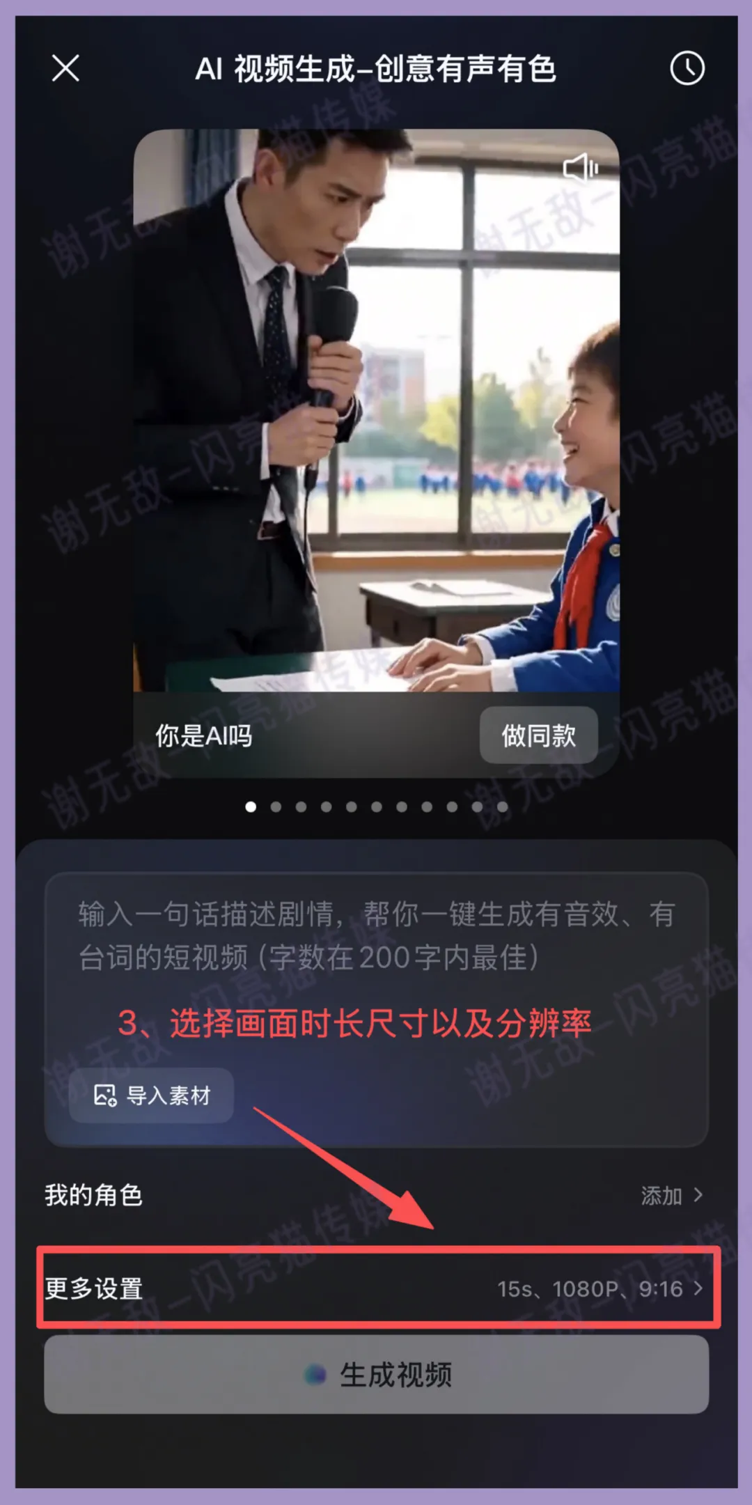 选择视频时长、分辨率和画面尺寸。
