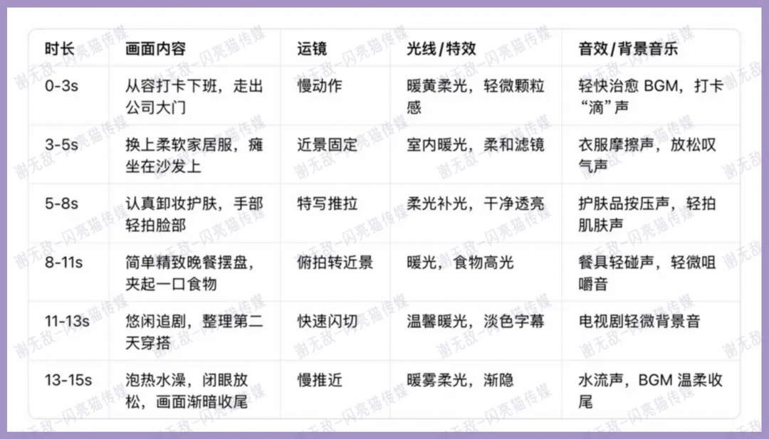 参考小红书热门下班生活日常治愈系动画 Vlog,写一条同风格的下班生活日常Vlog 分镜脚本,内容是:【结束一天忙碌工作,下班从容打卡,轻装通勤回家。换上柔软舒适的家居服,认真卸妆护肤,给自己做一顿简单又精致的晚餐。饭后悠闲追剧,整理好第二天的穿搭,再泡个舒服的热水澡,在属于自己的夜晚里慢慢放松,温柔又自律地结束一天。】整体氛围要温暖治愈。要求:以表格形式呈现,视频时长 15 秒以内,包含:时长、画面、运镜、光线 / 特效、音效。