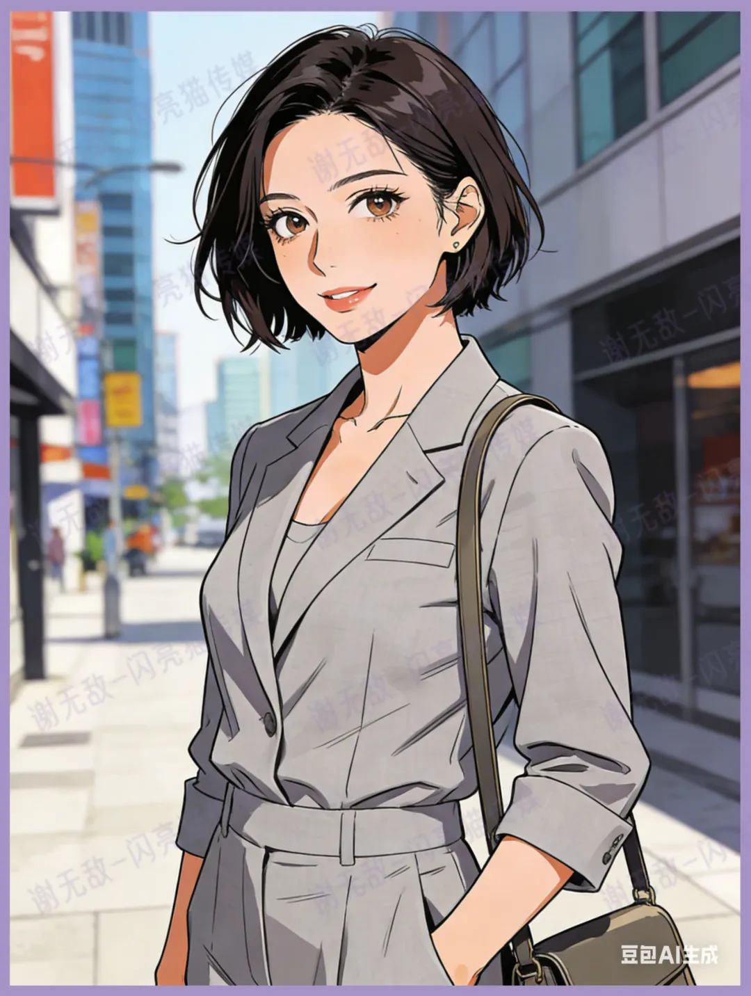 你现在是一名动漫人物形象设计师,需要你给我设计一个年轻女性(25岁的职场都市丽人)+短发高鼻梁大眼睛+身高165左右+正常肤色+浅灰色的西装套装(偏休闲)的漫画形象。