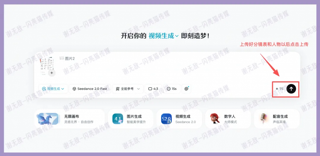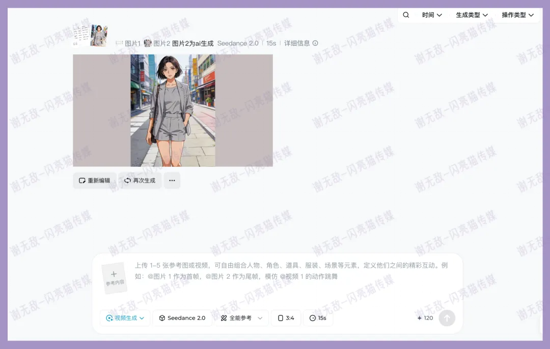 这里要特别注意,模式一定要选“全能参考”,不然没办法用分镜表格和自己的人物形象生成视频,这一步非常关键,好多人都容易在这出错!!