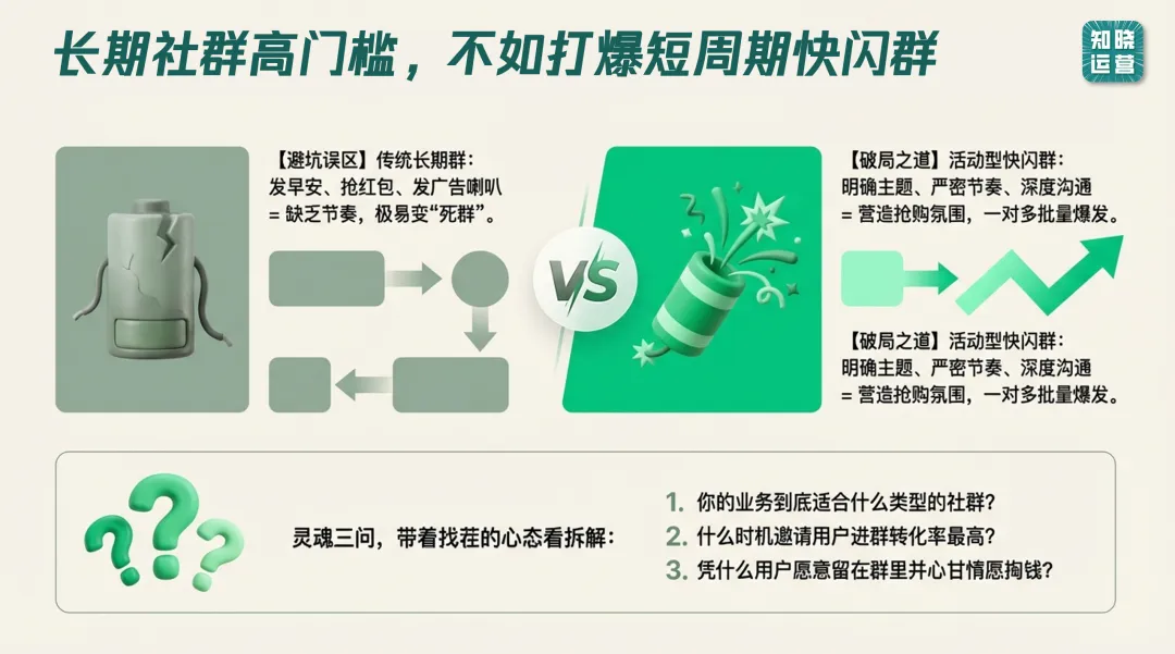相比半死不活的长期群,有明确主题、严密节奏的活动型快闪社群爆发式转化价值更大。