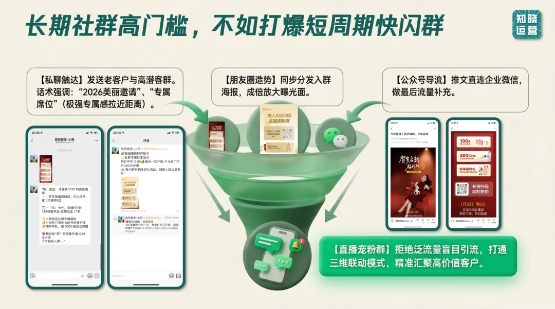- 公众号导流:通过公众号推文直接引流到企业微信,为接下来的直播做最后的流量补充。这种全渠道的触达,让流量像漏斗一样,从各个端口精准地向直播宠粉群集中汇聚。