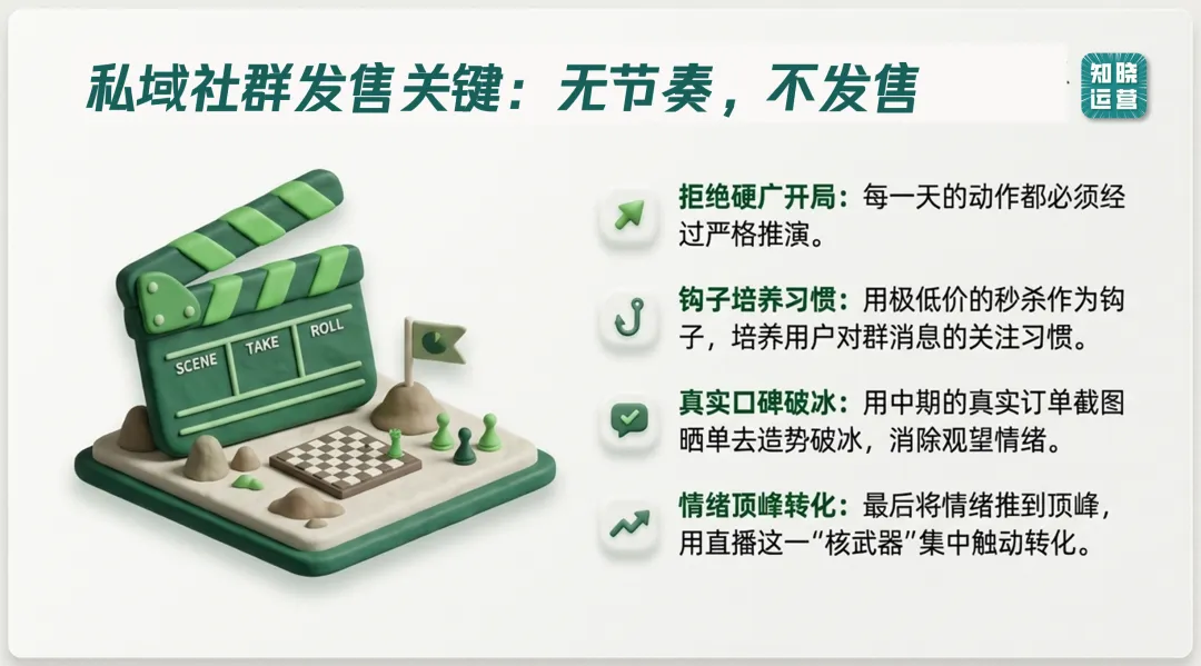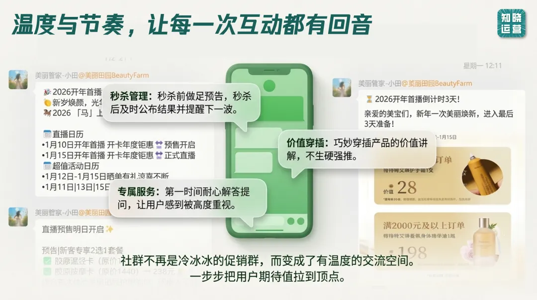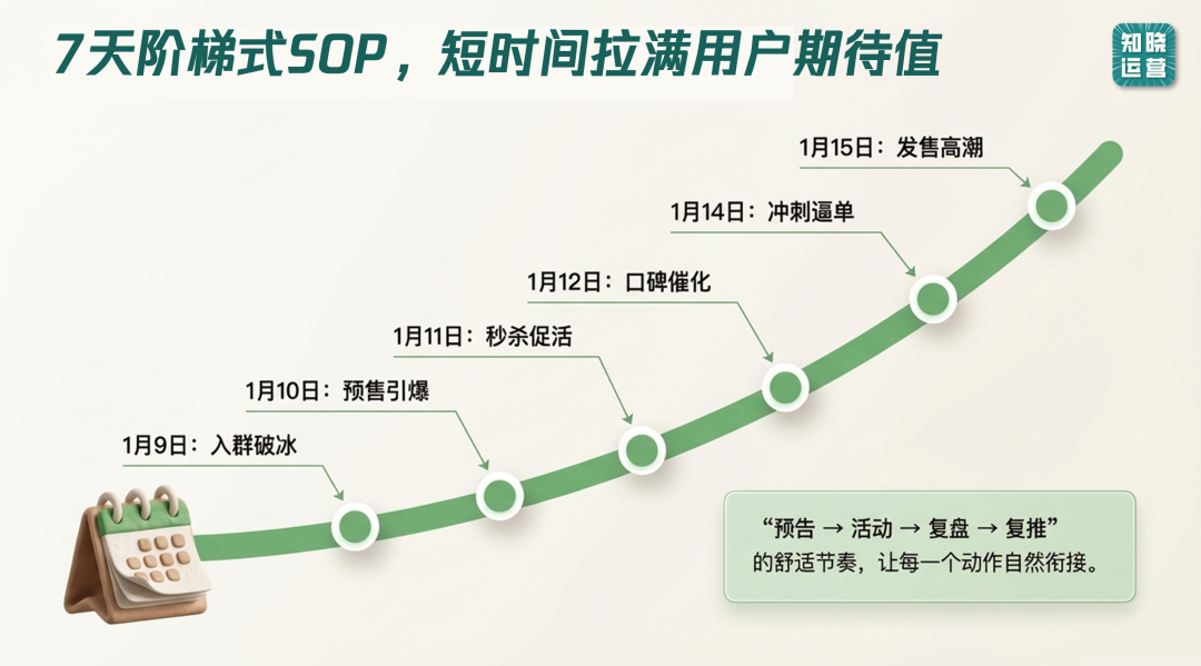 每天的核心环节是什么、发什么话术、配什么物料,都安排清晰,让群氛围层层递进,维持热度到直播发售高潮。