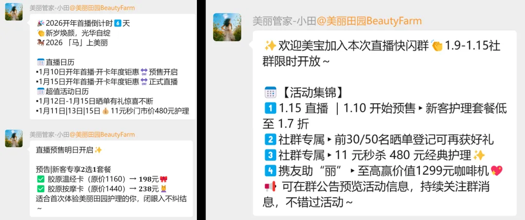 - 私聊触达:直接对老客户和高潜客群发送专属邀请,话术中特意强调“2026美丽邀请”、“专属席位”,用这种极强的专属感迅速拉近心理距离。