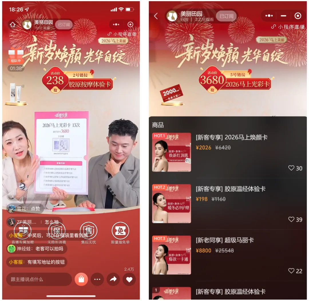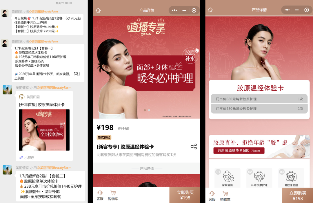 全天开启预售,主推新客专属的2选1体验套餐。胶原温经卡只要198元(原价1160元)、胶原按摩卡238元(原价1440元),用这种极其残暴的性价比直接吸引新客闭眼下单。