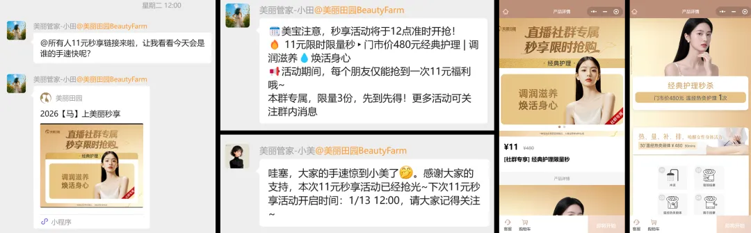 这三天分三次开启“11元秒杀480元经典护理”活动,每天严格限量3份。用这种极致的稀缺福利,瞬间引爆群内的抢购氛围。