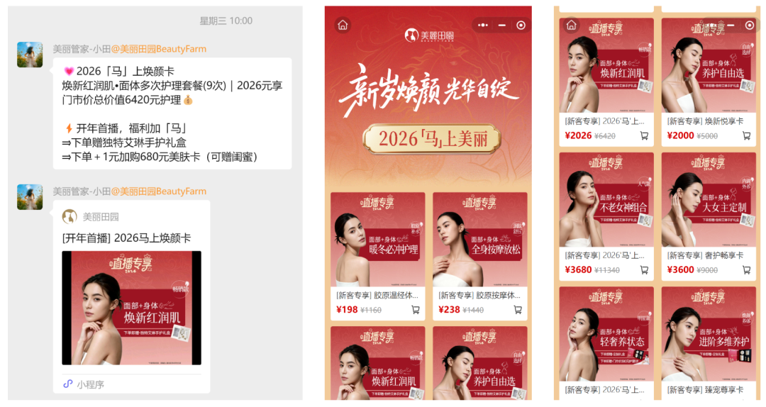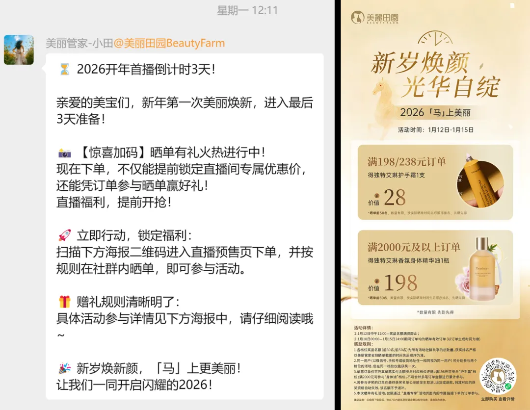 同时,搭配定制的入群海报,紧扣马年主题打出“2026「马」上美丽”,形成了强烈的记忆点,福利信息也一目了然,降低了用户的决策入群门槛。