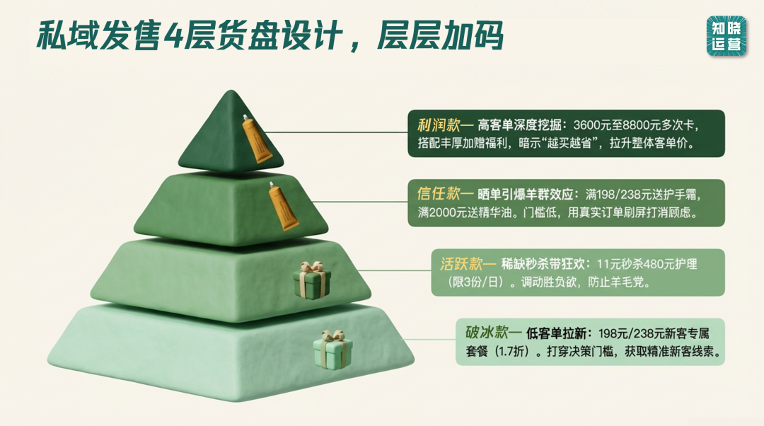 他们采用了阶梯式福利加码的逻辑,从低客单到高客单,从新客专属到新老同享做了四层运营: