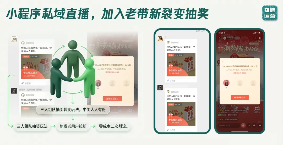 最精妙的是,他们设置了“三人组队抽奖”的裂变玩法:只要组队成功就能抽取眼部精华乳,而且承诺中奖人人有份。