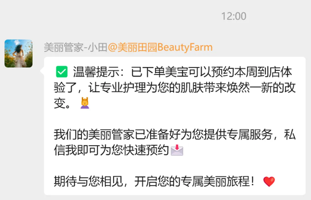 及时的预约指引让消费体验如丝般顺滑,而一旦用户在店里体验好了,新客自然会变成老客,老客会变成死忠粉,为下一轮的私域复购和口碑传播攒足能量。