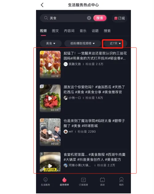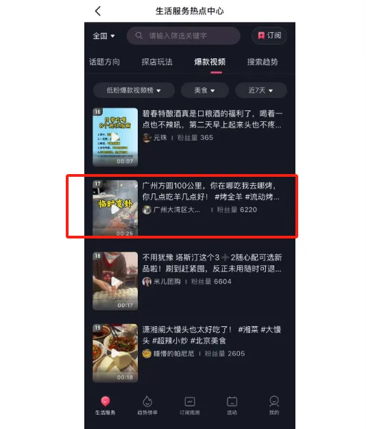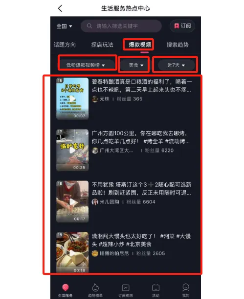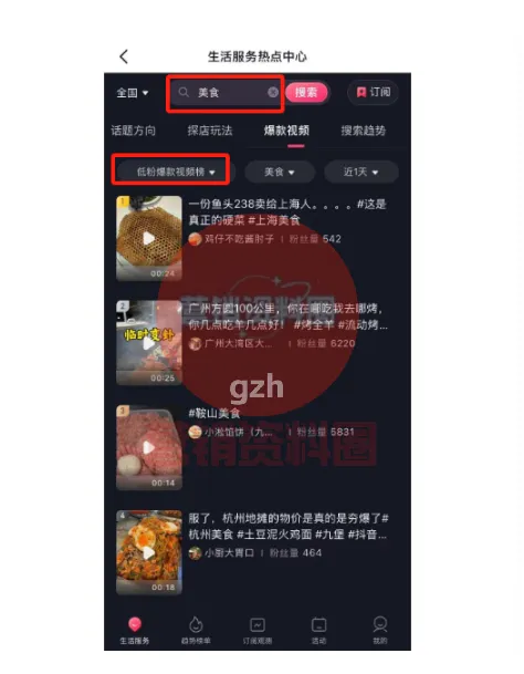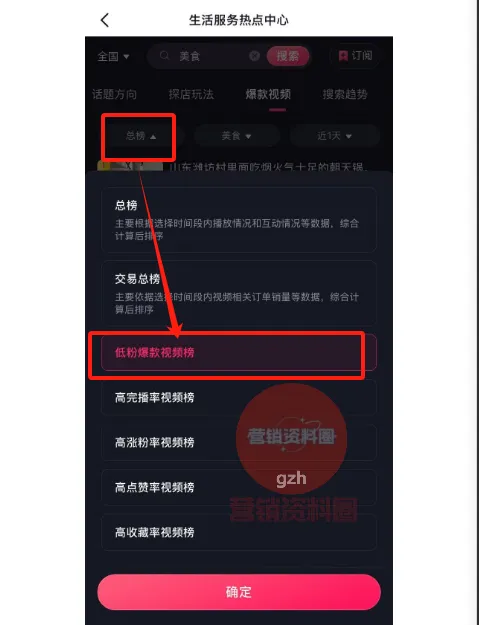 ②比如说你是做美食的你就搜”美食”,搞生活服务类的开实体店的。 ③一定找到“总榜”选择“低粉爆款视频榜”。