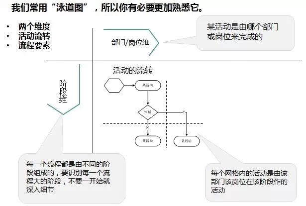 再回过头来说泳道图,泳道图有几个关键点:两大维度,活动流转,流程要素。我们会在以后详解。