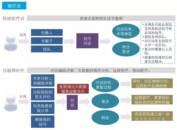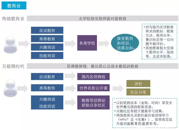 对传统医疗行业就不吐槽了,北京取消淘宝挂号时,快刀青衣作为一个父亲就声泪俱下地写过一篇《奶爸亲历:为什么我要毫无底线地支持淘宝挂号!》。 这同样是一个权力寻租的问题,同样我相信未来这些问题会被彻底瓦解。预测未来的医疗行业将全面与互联网接轨。 从患者角度来说: 第一,各个医院以及医师的口碑评价会在互联网上一目了然,当你看完病你就可以马上对该医生进行评价,并让所有人知道。 第二,用户的生病大数据会跟随电子病历永久保存直至寿终。 第三,未来物联网世界会将你的一切信息全部联网。你几时吃过什么饭,几时做过什么事,当天的卡路里消耗统统上传到云端。医生根据你的作息饮食规律即可更加精准的判断。 第四,更多时候患者可以选择无需医院就医,基于大数据的可靠性,可以直接远程解决,药物随后物流送达。 从医疗行业角度来说: 第一,病人描述病情的时间会缩短,沟通成本降低过后医院效率也会大幅上升。 第二,医院的不透明性会被迫开放,各种药品价格不再是行业机密。 第三,当区域性的技术资源问题解决之后,医院也将进入自由市场,变成以服务用户为中心的优胜劣汰。 13、教育行业