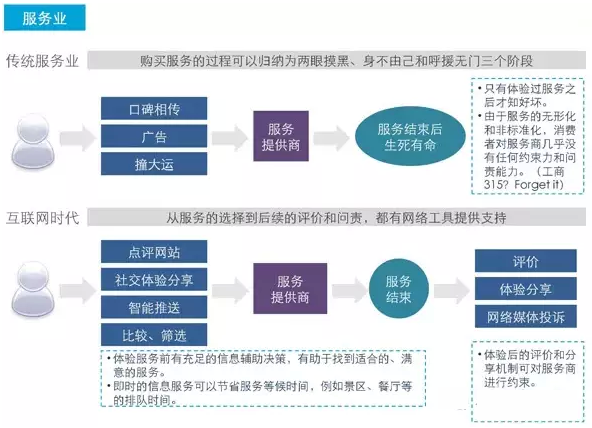 传统新闻业被寡头垄断,在这样一种垄断之下,实际上是在垄断真相。自媒体,以及小微媒体可以说是随着互联网发展进程的必然产物。互联网进化最大的特点就是,透明!透明!再透明!福柯说过话语的本质就是权力意志,如果说新闻业是话语霸权的主导者,那么自媒体就是对话语霸权的解构,使得话语权力回归到每一个有话语权的言说者身上。 传统新闻业的报道都是冷酷客观的,而自媒体则更加主观更加人性化,是以“人”的身份去做这样一份事业。也就是说未来的自媒体,不仅仅是某个行业新闻发布的品牌,还是一个有血有肉的个人人格。 从传统新闻行业到自媒体,可以看做是从话语权威机构对人的信息传播变为一个有人格魅力的人对人的信息传播。另外,自媒体从业人员要想盈利,前提必定是需要依靠强大的个人人格魅力,吸引到真正为你疯狂的粉丝。 预测未来的新闻业: 1、传统新闻媒体的话语权衰弱,话语权将被分散到各个自媒体的山头。新闻业会反过来向自媒体约稿。 2、自媒体模式必将寻找到可行的赢利点,届时未来会有更多的新闻业中的人会出走办自媒体。 6、通信业 可以说通信行业被OTT是注定的命运。传统的通信业,开路收费模式,如寄信、通话等都是为你开路然后收钱。而互联网的出现却完全无视这些规则,互联网要求人与人更紧密的链接,每一秒都可以以最低成本随时联系得到,于是3G的普及也同时意味着特洛伊木马的彻底接入。 预测未来的通信业: 1、世界可能不再需要手机号码而是WiFi,对电话和短信的依赖越来越降低,直到有一天电话的技术被彻底封存起来,就像当年的电报一样。同时手机号码,电话号码等词会出现在历史课本里。并非耸人听闻。 2、未来你的手机不再需要2G 3G 4G 5G…..信号,而是WiFi,那时候的WiFi技术也将升级普及,WiFi技术会进行无缝对接,无处不在。当无线技术突破后有线宽带也将迎来终结。而那时也是人类进入全面的物联网时代。不再是人与人的通信,更多的是人与物、物与人、物与物的通信。 7、物流行业 电子商务撬动物流行业。可以说物流行业沾了电子商务的光才如此红火。曾经的邮政平邮有谁还记得呢?虽然当前的物流业非常繁荣是互联网的产物,但是这个行业却依然一片乱象,参差不齐。 从互联网的要求来看思考物流业面对的压力: 1、电子商务要求服务更完善的物流。 2、电子商务的不断繁荣决定物流将面临更大的承载能力。 3、由互联网建立的问责机制会使物流业优胜劣汰。 那么预测物流行业: 1、最后会产生几足鼎立的局面,小鱼要么被大鱼收购吃掉要么自身自灭,而活下来的大鱼一定会建立起非常完备的整套流程。 2、活下来的物流企业对用户的服务也将随竞争优化,无论是对寄件人还是收件人,这些活下来的物流公司都会为其建立起完美的超越以前服务。无需阿里的参与都会建成,只是时间尚未到来。随着时间的沉淀,这些问题自然会不成问题,只不过我们还需要耐心。是互联网要求物流行业的崛起,同时互联网也在要求更高质量的繁荣。 8、酒店业与旅游行业 传统的酒店业与旅游行业由于信息的不透明性,经常会发生各种宰客现象,由于很多集团的利益纠葛,使得个人消费者的维权步履维艰。而当互联网出现后,这些被隐藏在黑暗角落处的东西会被彻底挖掘出来晒在阳光下。“海南一万元午饭”事件就是一次很好的互联网曝光案例。 预测未来的酒店业与旅游行业: 1、互联网为二者建立起强大的问责制,未来一定有个大一统平台对这两个行业进行细致的评判考核。消费者受害的可能性会大大降低。与此同时,这两个行业也将得到超越来自政府的更强有力的监督,不敢擅自作恶。 2、从消费者的角度再转移到这两个业本身来说,这两个行业的未来一定会利用起互联网大数据,对消费者的喜好进行判定。酒店可以为消费者定制相应的独特的个性房间,甚至可以在墙纸上放上消费者的微博的旅游心情等等。旅游业可以根据大数据为消费者提供其可能会喜好的本地特色产品,活动,小而美的小众景点等等,旅游业还可根据其旅行的时间地点以及旅行时的行为数据推送消费者可能会喜欢的旅游项目。 预测未来这两个行业不仅会自律还会做的更好,利用互联网沉淀出的大数据,想象力无穷。 9、餐饮行业
