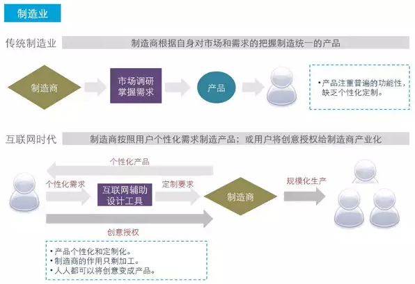 互联网最有价值之处不在自己生产很多新东西,而是对已有行业的潜力再次挖掘,用互联网的思维去重新提升传统行业。从这个角度去观察,互联网影响传统行业的特点有三点: 1、打破信息的不对称性格局,竭尽所能透明一切信息。 2、对产生的大数据进行整合利用,使得资源利用最大化。 3、互联网的群蜂意志拥有自我调节机制。 把人类群体思维模式称为群蜂意志,你可以想象一个人类群体大脑记忆库的建立:最初的时候各个神经记忆节点的搜索路径是尚未建立的,当我们需要反复使用的时候就慢慢形成强的连接。在互联网诞生之前这些连接记忆节点的路径是微弱的,强连接是极少的,但是互联网出现之后这些路径瞬间全部亮起,所有记忆节点都可以在瞬间连接。这样就给了人类做整体未来决策有了超越以往的前所未有的体系支撑,基于这样的记忆模式,人类将重新改写各个行业,以及人类的未来。 以下是对各行业的盘点: 1、零售业 传统零售业对于消费者来说最大的弊端在于信息的不对称性。在《无价》一书中,心理实验表明外行人员对于某个行业的产品定价是心里根本没有底的,只需要抛出锚定价格,消费者就会被乖乖的牵着鼻子走。 而C2C、B2C却完全打破这样的格局,将世界变平坦,将一件商品的真正定价变得透明。大大降低了消费者的信息获取成本。让每一个人都知道这件商品的真正价格区间,使得区域性价格垄断不再成为可能,消费者不再蒙在鼓里。不仅如此,电子商务还制造了大量用户评论UGC。这些UGC真正意义上制造了互联网的信任机制。而这种良性循环,是传统零售业不可能拥有的优势。 预测未来的零售业: 1、会变成线下与线上的结合,价格同步。 2、同质化的强调功能性的产品将越来越没有竞争力,而那些拥有一流用户体验的产品会脱引而出。 3、配合互联网大数据,将进行个性化整合推送(如亚马逊首页的推荐算法)。 2、批发业 传统批发业有极大的地域限制,一个想在北京开家小礼品店的店主需要大老远的跑到浙江去进货,不仅要面对长途跋涉并且还需要面对信任问题。所以对于进货者来说,每次批发实际上都是一次风险。 当阿里的B2B出现之后,这种风险被降到最低。一方面,小店主不需要长途跋涉去亲自检查货品,只需要让对方邮递样品即可。另一方面,阿里建立的信任问责制度,使得信任的建立不需要数次的见面才能对此人有很可靠的把握。 预测未来的批发业: 1、在互联网的影响下,未来的B2B应当是彻底的全球化,信任问题会随时间很好的建立。 2、在互联网繁荣到一定程度后,中间代理批发商的角色会逐渐消失,更多直接是B2C的取代。 3、制造业 传统的制造业都是封闭式生产,由生产商决定生产何种商品。生产者与消费者的角色是割裂的。但是在未来,互联网会瓦解这种状态,未来将会由顾客全程参与到生产环节当中,有用户共同决策来制造他们想要的产品。也就是说,未来时代消费者与生产者的界限会模糊起来,而同时传统的经济理论面临崩溃。这也是注定要诞生的C2B全新模式。 小米手机就是一款典型的用互联网思维做出的产品。就像凯文凯利在《技术元素》中描述的维基百科,底层有无限的力量,只要加入一些自顶向下的游戏规则,两者结合后就会爆发出惊人的力量。于是也就彻底超越大英百科全书。当前的制造业和大英百科全书有点像,在耗费着各种人力物力去做一件及其困难的事情,完全没有用到互联网的力量。 预测未来的制造业: 1、传统的制造业将难以为继,大规模投放广告到大规模生产时代宣告终结。 2、会进入新部落时代,个性化,定制化,人人都是设计师,人人都是生产者,人人都在决策所在的部落的未来。这,就是互联网的游戏规则。 4、广告业 传统广告行业理论已然崩溃,当前已由大规模投放广告时代转变为精准投放时代。谷歌的AdWords购买关键词竞价方式,可算是互联网广告业领头羊。传统广告是撒大网捕鱼,那么谷歌的AdWords就是一个个精准击破。AdWords的精准之处不仅仅在于关键词投放,投放者还可以选择投放时间、投放地点、模糊关键词投放、完全匹配关键词投放等等精准选择。 不仅在搜索处如此精准,在网站联盟投放也讲究精准。只要各位在百度,谷歌,淘宝搜索过相应商品关键词后进入有这些网站联盟的网站,该网站广告处都会出你所搜索过的产品现相关广告。精准之程度,对比传统广告业可谓空前。这种做法的本质其实就是一种大数据思维 预测未来的广告业: 1、未来的广告业将重新定义,进入精准投放模式。 2、未来广告业将依托互联网大数据进行再建立。在未来,在你酒后驾车被罚后,也许你老婆的手机里面会出现是否需要为你购买保险的短信广告。 5、新闻业