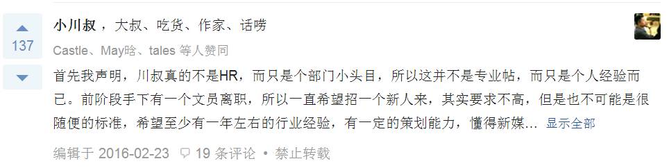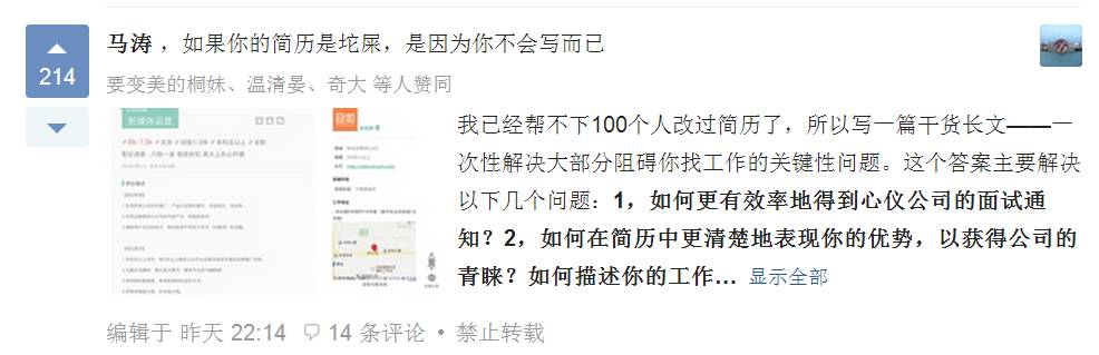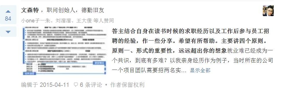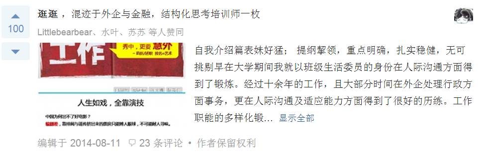 5.2 反例二 https://www.zhihu.com/question/20184884/answer/44497229 ①明确目标受众——金融类有求职意向的毕业生。 这篇回答其实凭心而论写的挺好的,开头卖点总结的挺好的,逻辑结构清晰,有理有据阐述卖点,排版过得去,还有配图说明。但为什么排名不高呢?因为目标用户是金融类的,语言实在太过高大上,很多冲着开头看下去的瞬间觉得和自己想要的差距太大了。 5.3 反例三 https://www.zhihu.com/question/20184884/answer/19542909 这个答案让我印象非常深刻,鼠标滚了20几下就想关掉了,结果为了有效评判,硬是忍着恶心滚到了底,总共滚了142下才见底。也真心对作者无语,写了这么多,对读者一点help都没有…… 同样,我们用5条原则来评判一下: ①明确目标受众——不知道在说什么 ③有效阅读时间——不知道在说什么 6.总结 长答案但没有帮助的基本都是点进去一眼扫过去,不知道作者在说什么的,铺垫太长,没有重点,或是目标用户不符的,基本把踏浪100文案本能课程教的错误写法都给演示了一遍。 所以,想要写好一个知乎问题的答案,一定要在写作前就把5条原则对应的内容想想清楚,而且要一条一条详详细细地写出来,这样子答案才能写得好,写得出彩! 来源:踏浪100 |