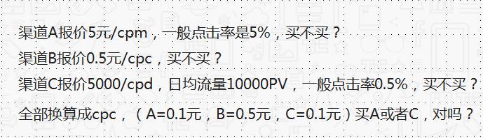 在上面这个例子中,流量运营的同学都会比较熟悉,不同的三个渠道有三种不同的报价方式。A跟C价格都还可以,那是不是就直接买A和C就可以?不一定,因为A跟C它每一个点击,它所换来的一个转化效果,其实可能是不一样的。比如说C可能每5个点击,有一个用户的进行转化。那么他给你带来的这个收入是一个固定的值。如果A有另外一个数据的话,它带来的收入值,可能又是不一样的。所以你只有监测到它的转化和渠道的来源,才能做出最精确的判断。